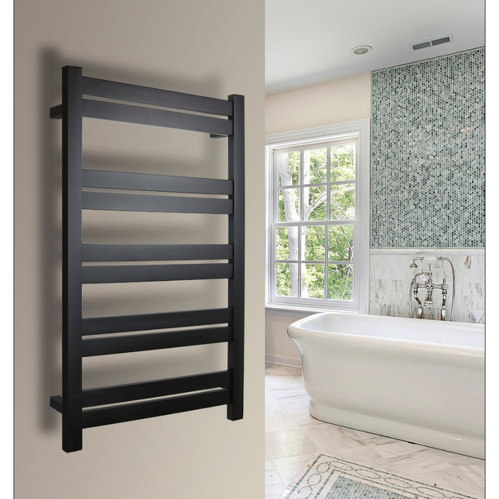 Sometimes huge performance comes in small packages, which is perfectly embodied by the Grande 10 towel warmer from WarmlyYours. The compact profile of this model means it can be installed in a wide variety of locations, while its heat output of 460 BTUs per hour stands toe-to-toe with nearly any electric towel warmer on the market. The broad bars of the Grande 10 offer extra surface area for expedient heating and the design incorporates a spacing that allows the top pair of bars to perfectly accommodate hand towels. The matte black finish of the Grande 10 serves as a visually striking compliment to the lighter colors used in contemporary bathroom design. This model comes with built-in TempSmart™ protection to prevent the unit from overheating. Features: 10 heated bars. Matte black finish. Durable stainless steel construction. Heat output: 460 BTUs per hour. Hardwired connection eliminates visible wires. Easy-to-use integrated power switch with indicator light. Safe: cULus Listed with built-in overheat protection Warranty: 5 years Specifications:
