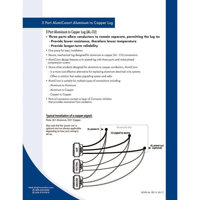 King Innovation’s AlumiConn Aluminum to Copper Lug is approved by the Consumer Product Safety Commission (CPSC), UL, and numerous insurance companies as a safe method for aluminum wiring repair. Manufactured in Missouri, AlumiConn is a lug style connector with three separate ports to eliminate intermixing of conductors. It coats aluminum wires with a thin layer of silicone sealant to provide resistance from oxidation, and uses set screws to break up surface oxides and provide a secure mechanical connection. Avoid a complete re-wire by using AlumiConn, the most cost-effective aluminum wiring repair solution available.