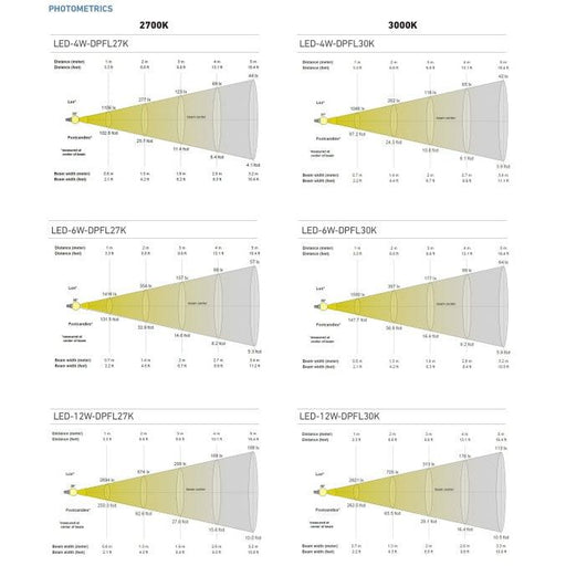 • Beams: narrow spot (10–15 deg), spot (24–30 deg), flood (36–40 deg), wide flood (60 deg+)