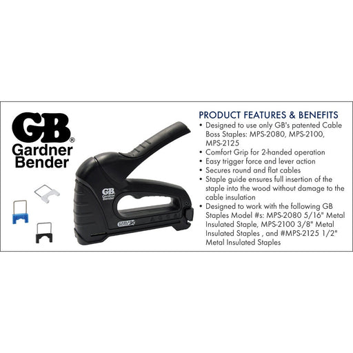 King InnovationOriginal price $ 0.00 - Original price $ 0.00Original price $ 0.00$ 9.48$ 9.48 - $ 9.48Current price $ 9.48| /Spec Sheet The Gardner Bender Cable Boss Staple Gun is a professional grade cable staple gun able to secure both 120V and low-volt cable from the s...