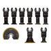 Our OPEN-LOK™ Multi-Tool Blade Variety Kit 9PC provides you with an assortment of blades for multi-material, hardwood and clean wood cutting applications. The set includes a Carbide Teeth metal blade that lasts up to 50X longer than standard bi-metal blades and can be used in a wide range of metal materials while maintaining longer blade life such as; screws, bolts, nails, and more. TITANIUM CHARGED™ Bi-Metal blades have an optimized titanium blend for maximum wear-resistance and up to 15x longer life vs. high carbon steel (HCS) blades. These bi-metal multi-tool blades are ideal for wood with nails, PVC, and drywall. The Triple-Ground Japanese Tooth hardwood blades deliver up to 2X faster cuts than the previous MILWAUKEE® HCS blades and features a PRO-CURVE™ cutting edge for greater control. The Japanese Tooth blades are ideal for fast, clean cuts in hardwood and can also be used in clean wood, PVC, and drywall. The set also includes high carbon steel (HCS) blades designed with aggressive, edge-ground teeth for fast wood cutting. These blades feature a reinforced Universal Fit OPEN-LOK™ anchor for better strength & control and allow for quick blade changes across 100+ multi-tools. Not compatible with Starlock tools. The set is organized in a hard case for storage. MILWAUKEE® oscillating multi-tool blades are designed and made in the USA with global materials.