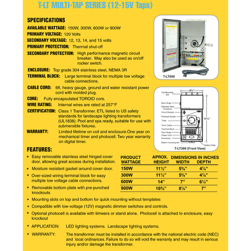 Landscape lighting transformers power your 12-volt system with clean, reliable output. Choose compact magnetic or electronic models, multi-tap 12–15V units for longer runs, and enclosures with built-in timers, photocells, or smart control.