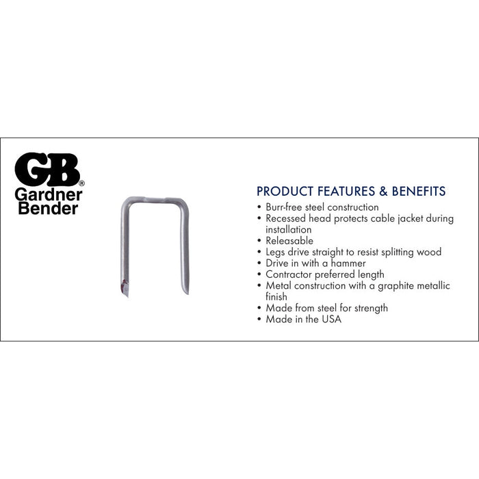 Las grapas de metal de grafito cuentan con una construcción de metal duradera con un acabado metálico de grafito. Estas grapas son ideales para asegurar cables no metálicos y se pueden clavar con un martillo. Los cabezales empotrados ayudan a proteger el cable y las puntas afiladas ayudan a que las grapas se inicien fácilmente.