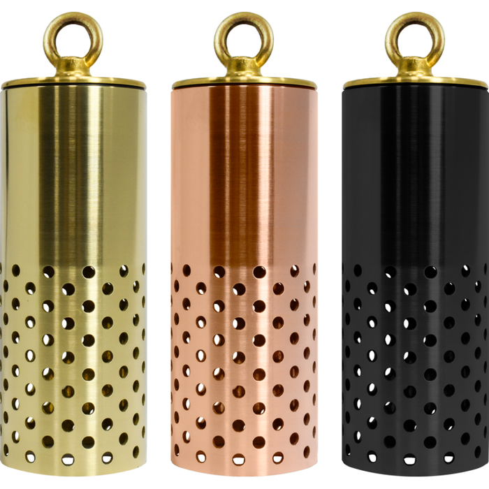 The Bryce Perforated fixture is available in the following finishes: machined copper, brass, or black brass (Cerakote®).