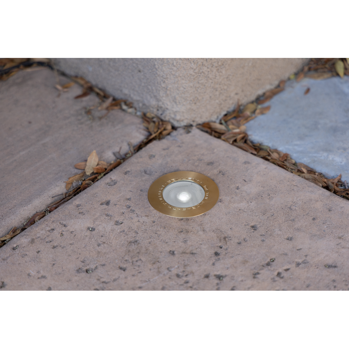 The Carlsbad Well Light is fitted for any MR16 lamp and comes to life with the Brilliance Chameleon MR16. The flat top comes in a brass finish.
