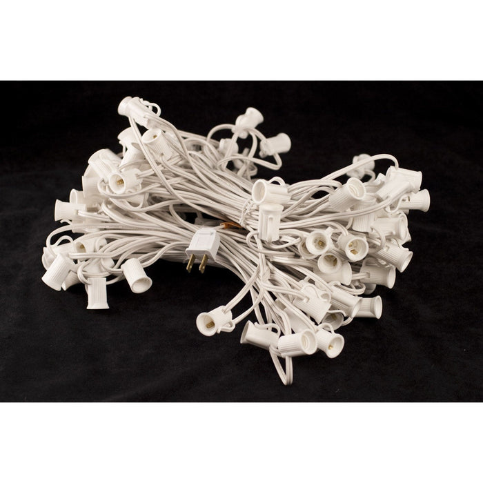 Socket wire is an important component to many dramatic displays. Our socket wire is cuttable to any length giving you the flexibility to cover any distance. Male Plugs and Female Outlets are a quick install onto cut lead ends allowing you to chain socket wires for distance or to end your run. The 12" spacing of the sockets offers ease of measuring when you need that one more socket. Our sockets are extra strong to stand up against the elements and they also contain a drain to allow moisture to drain off through the socket. This helps prevent freezing temperatures from cracking and rendering the socket of no use. Our All-In-One Clip on the socket makes installation easier as they can easily clip to gutters or roof shingles without causing damage. For extra money savings pair the sockets with our C9 LED bulbs. C9 LED bulbs offer you a great way to bring a lot of light, color, and allure to any architecture or structure.