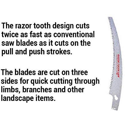 - The razor tooth design cuts twice as fast as conventional saw blades as it cuts on the pull and push strokes.