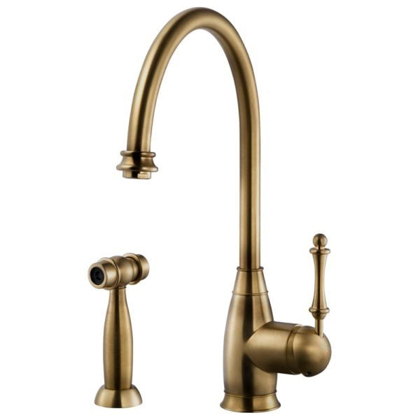 Traditional brass single lever kitchen faucet with high rotating spout and integral side spray.