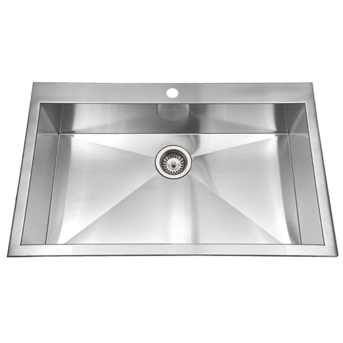 The Houzer BLS-3322 Bellus Series Topmount Zero Radius Large Single Bowl Sink is a smart, and easy upgrade for a laminate countertops without peer. Bellus series will sour your design palette to a new heights with pleasing simplicity when coupled with today's high performance laminate countertops. The Houzer BCS-3322 Bellus sink fabricated from heavy 18 gauge premium grade 304 stainless steel and features one hole, zero radius corners and bottoms, bold foundational feel to its raised rim and 4 inch back ledge, rear-set drain, scored drain-lines, exclusive MegaShield insulation. Overall size is 33 inc by 22 inch and bowl measures 30.5 inch by 16.75 inch and 9 inch depth. Covered by a lifetime limited warranty that protects against defects in material and workmanship and meets ASME A112.19.3-2000, UPC and CSA standards. Fits 36 inch cabinets.