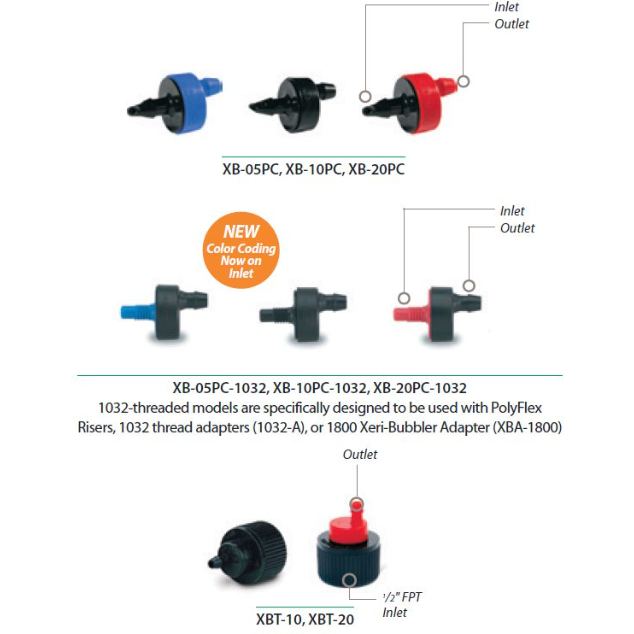 - 10-32 threaded inlet that easily threads into a PolyFlex Riser,1032 Thread Adapter or 1800 Xeri-Bubbler Adapter